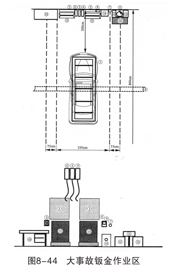 損傷修復(fù)和焊接作業(yè)區(qū)域可各設(shè)置 4~6個(gè)工位,每個(gè)工位的面積約400cm×800cm,每個(gè)工位配相應(yīng)的設(shè)備和操作臺(tái)(架)。車(chē)身校正作業(yè)一般設(shè)一個(gè)工位,面積500cm×800cm。如條件允許,可以根據(jù)不同類(lèi)型的校正架,設(shè)置2~3個(gè)工位。