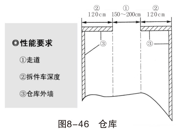 一個(gè)好的鈑金作業(yè)區(qū),必須要有一個(gè)良好的板件拆卸零件和材料倉(cāng)庫(kù)來(lái)配合,使整個(gè)廠區(qū)整潔。倉(cāng)庫(kù)面積大約是鈑金工位的2~3倍即可。如圖8-46所示。
