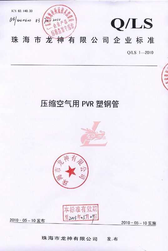 龍神壓縮空氣PVR塑鋼管成功申請企業(yè)執(zhí)行標準 2010年5月珠海市龍神有限公司“壓縮空氣PVR塑鋼管”得到珠海市質(zhì)量技術監(jiān)督局認可,特此頒發(fā)“壓縮空氣PVR塑鋼管企業(yè)執(zhí)行標準”,龍神公司在嚴格執(zhí)行標準下,保證產(chǎn)品質(zhì)量。 2010-05-20 10025