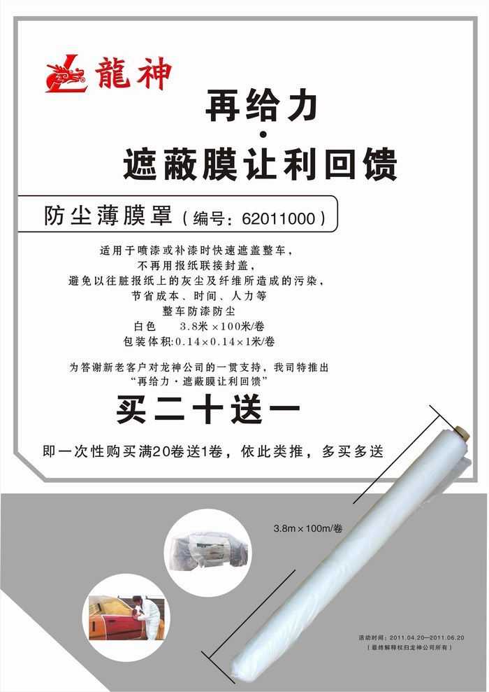 2011年4月再給力·遮蔽膜讓利回饋促銷! 2011年4月再給力·遮蔽膜讓利回饋促銷! (活動已結(jié)束,感謝您的關(guān)注) 一、活動主題: “再給力,遮蔽膜讓利回饋” 二、活動時間: 1、時間:2011年04月20日至2011年06月20日 2、時長:共計2個月 三、促銷產(chǎn)品: 防塵薄膜罩 尺寸3.8米*100米/卷 龍神編號:62011000 買20送1 ,一次性購買滿20卷送1卷,如此類推,多買多送。 2011-04-19 12415