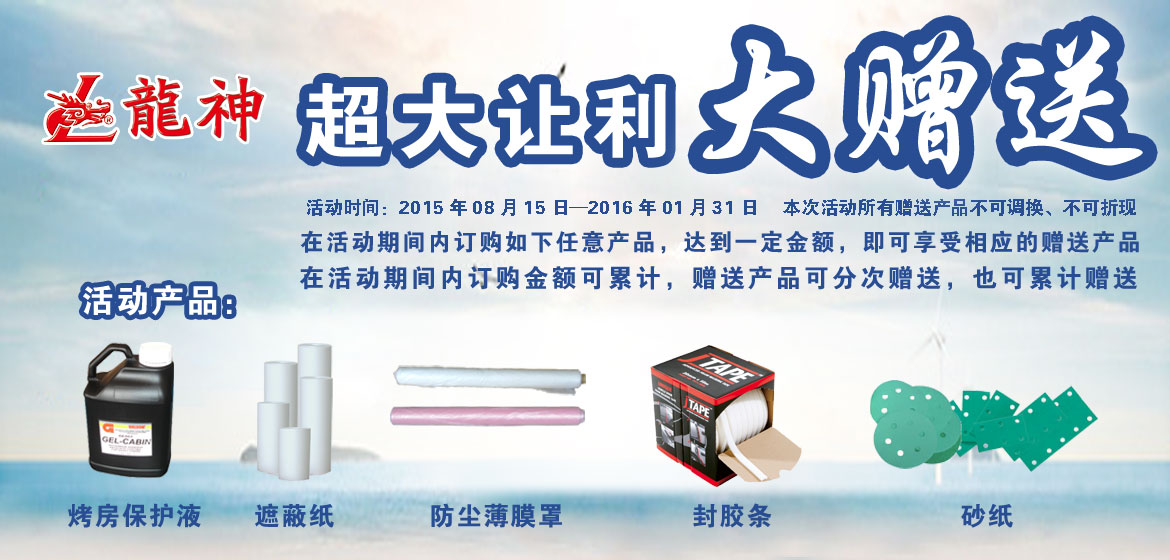 超大讓利﹒大贈送 2015-08-17 32058 訂購產(chǎn)品:1、烤房保護液; 2、遮蔽膜; 3、遮蔽紙; 4、泡沫膠條; 5、砂紙。 在活動期間內(nèi)訂購如上任意產(chǎn)品,達到下表累計金額,即可享受相應的贈送產(chǎn)品。