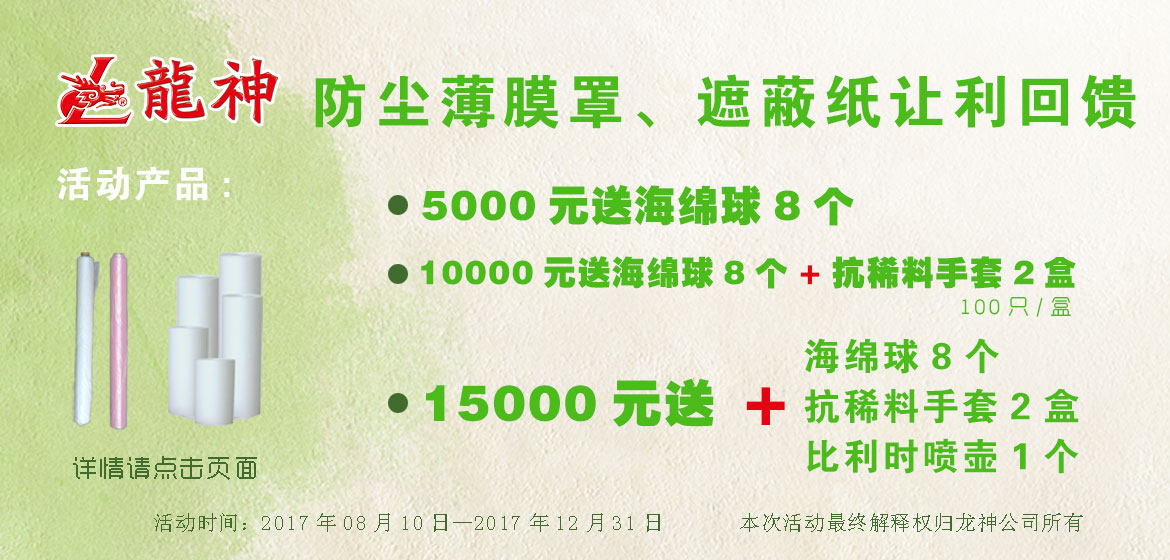 夏季讓利大回饋,遮避膜優(yōu)惠大促銷 2015-06-05 30336 買滿3000元,贈送紙漏斗500個; 買滿5000元,贈送除漆洗手膏1箱; 買滿8000元,贈送標準抹塵布1箱/24盒; 買滿10000元,贈送小切紙架1臺 。