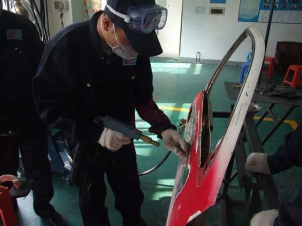 鈑金組朱老師指導正確使用鈑金整形架和工具修復車身